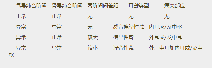 純音聽力檢查結果體現(xiàn)為純音聽力圖。</p><p> 正常情況下我們是通過兩條途徑來感受聲音信號的——氣導途徑和骨導途徑。前者我們非常熟悉,從外耳到中耳到內耳到聽中樞;后者我們或許不太注意:從顱骨直接到內耳到聽中樞。相應地,純音聽力檢查也有兩種聲音剌激方式,氣導輸入和骨導輸入。前者我們天天使用,而后者則很少被我們使用。事實上,兩閾值曲線的異同正是我們判斷聽損病變部位的基礎(見下表)。了解患者病變部位對于獲得他們的信任以及確定助聽器電聲性能都有非同尋常的意義。因此,有條件的時候還是應當重視骨導聽閾測試。</p><p style="text-align: center;"><img src="/upfiles/201906100237368907.png" alt="" /><br /></p><p> 更多詳情請登錄聽覺有道助聽器www.zhengzhoufuke.com</p>" />