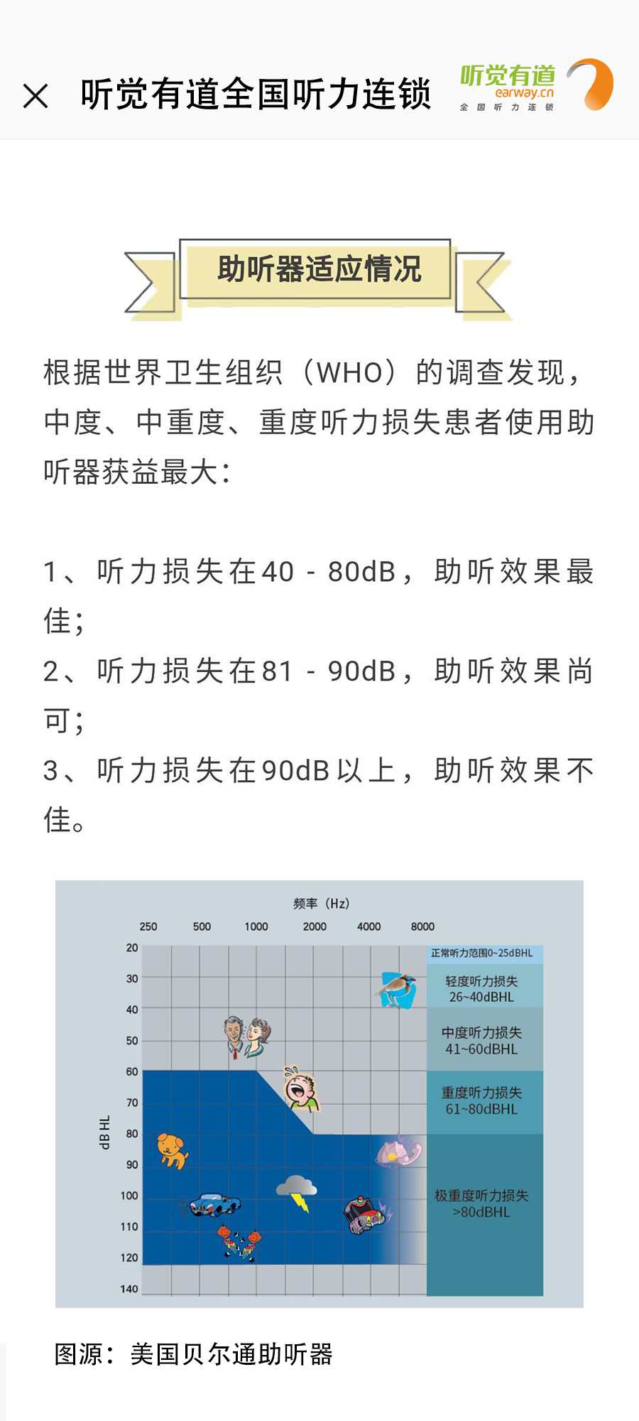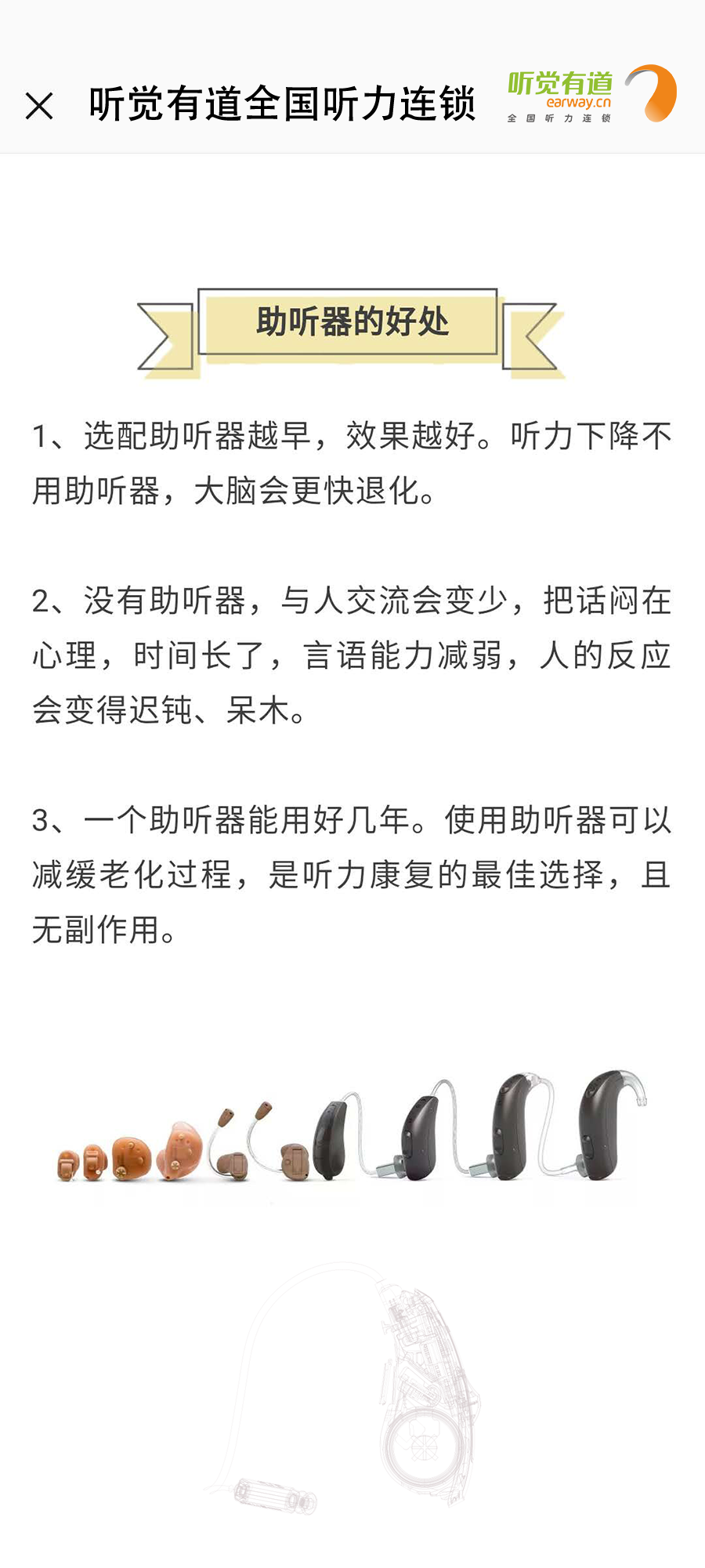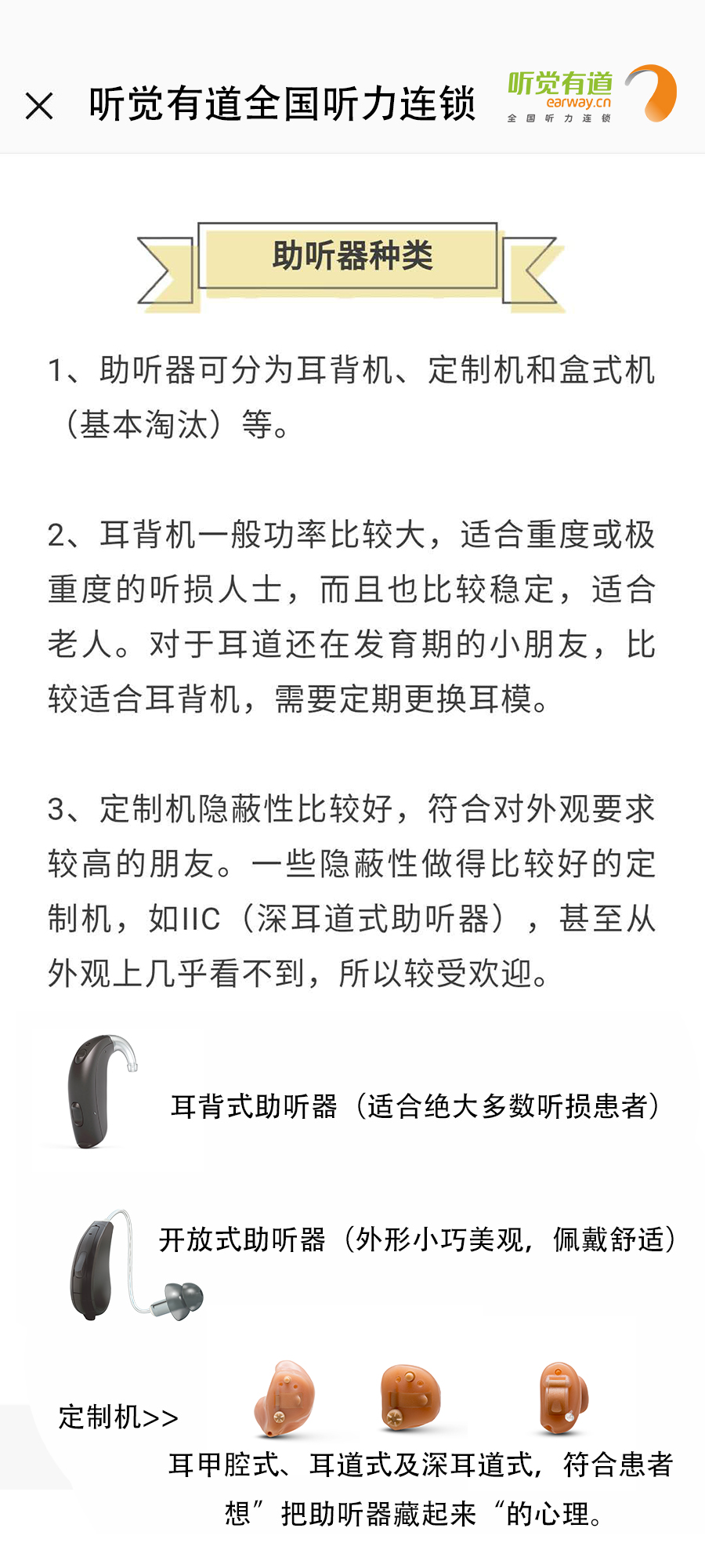 什么是助聽器?長什么樣子?有什么作用?如何使用?這里一一告訴您!</p><p> 助聽器是聽力障礙者使用的輔具,用來補足聽力損傷所造成的缺陷。廣義上講凡能有效地把聲音傳入耳朵的各種裝置都可以看作為助聽器,狹義上講助聽器是一個電聲放大器,通過它將聲音放大,使聽障者聽到了原來聽不清楚、聽不到的聲音。</p><p> 第一:助聽器的種類</p><p style="text-align: center;"><img src="/upfiles/201901180318143583.jpg" width="640" alt="" /><br /></p><p> 第二:助聽器的好處</p><p style="text-align: center;"><img src="/upfiles/201901180318334139.png" width="640" alt="" /><br /></p><p> 第三:如何適應助聽器</p><p style="text-align: center;"><img src="/upfiles/201901180318506440.jpg" width="640" alt="" /><br /></p><p> 第四:選配助聽器流程</p><p style="text-align: center;"><img src="/upfiles/201901180319039646.jpg" width="640" alt="" /><br /></p><p style="text-align: center;"><br /></p><p> 更多詳情請登錄www.zhengzhoufuke.com</p>" />
