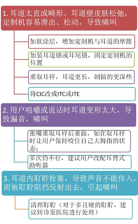 耳道的客觀情況是產生嘯叫的主要原因,其可能引起嘯叫的原因及解決方法如下: