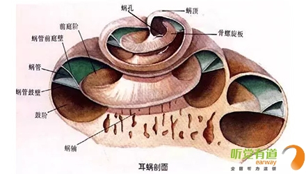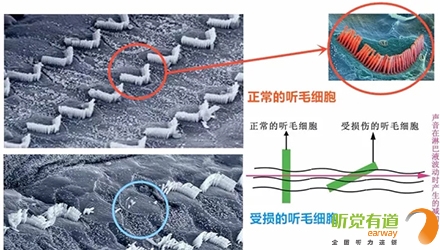 耳蝸中有四排毛細胞,其中只有一排(內毛細胞)用于直接感受聲音。另外三排(外毛細胞)則用于聽覺的動態處理,包括維持一個較大的可感知聲強范圍。人類可感知的聲壓變化高達萬億倍(1012,約130分貝;正是由于聲壓變化如此之大,人們才使用分貝這種對數關系來作為聲強單位)。此外,在聲音(空氣分子的振動)傳播到內毛細胞時,已經完成了初步的知覺加工,比如對不同頻率聲音的分離。長期聽力損傷常常涉及到這些毛細胞的損傷,無法通過簡單地擴大聲音強度來彌補。
