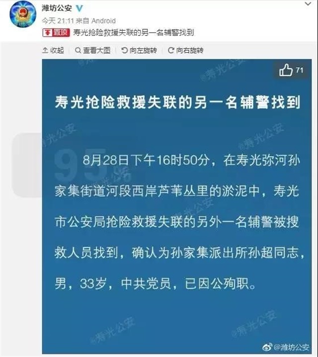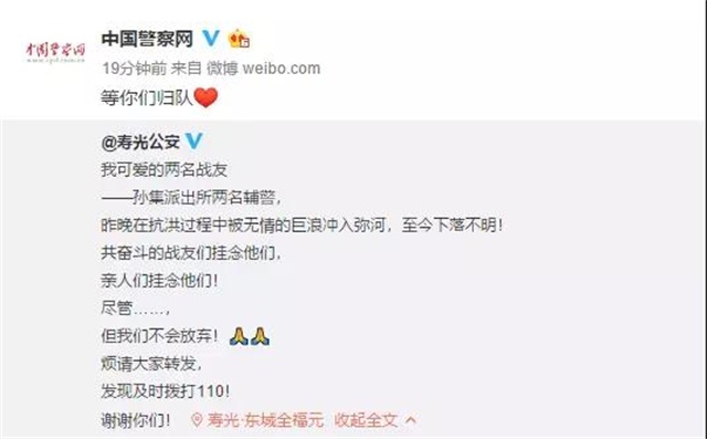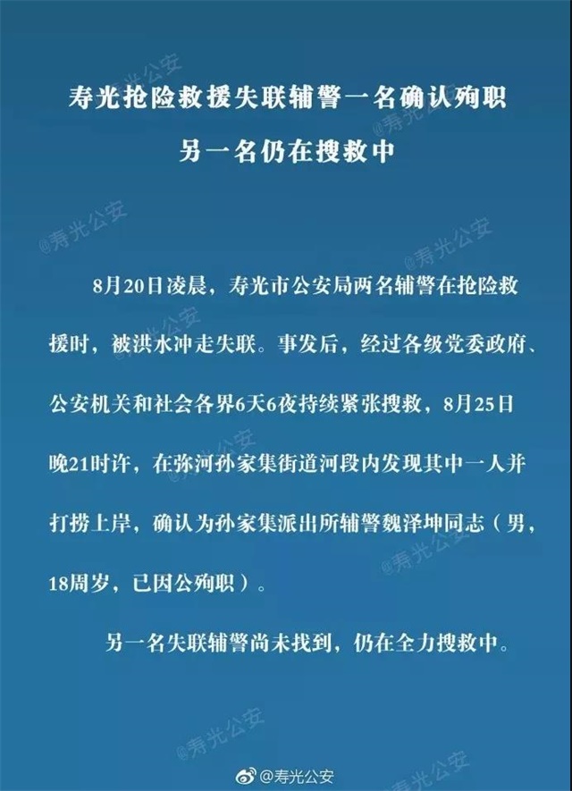<span style="font-size: 16px;"> 2018年8月20日凌晨,壽光市兩名輔警在搶險救援時,被洪水沖走失聯(lián)。事發(fā)后,經過連續(xù)幾天的緊張搜救,他們以我們最不愿意看到的方式歸來了。</span></p><p><span style="font-size: 16px;"> 8月25日晚21時許,在彌河孫家集街道河段內發(fā)現(xiàn)一人,確認為孫家集派出所輔警魏澤坤同志(男,18周歲,因公殉職)。</span></p><p><span style="font-size: 16px;"> 8月28日下午16時,在彌河孫家集街道河段西岸發(fā)現(xiàn)另一名輔警,確認為孫家集派出所孫超同志(男,33歲,因公殉職)。</span></p><p><span style="font-size: 16px;"> 他是家里的頂梁柱啊</span></p><p><span style="font-size: 16px;"> 33歲的孫超是家里的頂梁柱,他的愛人郭立華是聽覺有道的店長。</span></p><p><span style="font-size: 16px;"> 孫超有一子一女,大女兒才滿10歲,父母年近60,身體都不是很好。還有一個85歲的老奶奶,身體也不好,孫超失蹤時,一家人一直都不敢告訴她消息。</span></p><p><span style="font-size: 16px;"> 18日早,因為下雨,孫超怕路不好走,還提前送郭店長到門店上班,然后才回派出所。</span></p><p><span style="font-size: 16px;"> 事發(fā)前2小時,他們夫妻互通了電話。孫超說,自己全身濕透了,水很大,11點之后,就沒有了音訊。</span></p><p><span style="font-size: 16px;"> 他們夫妻倆都是好員工,孫超還是共產黨員,他們沒有好好地拍過幾張全家福,甚至沒能抽空一家人好好玩一天。</span></p><p><span style="font-size: 16px;"> 孫超是個好老公,他一回家就看孩子,哄孩子睡覺,一有空就給老婆孩子洗衣服。為了省錢養(yǎng)家,他連幾十塊錢的鞋子都舍不得買,老婆給他買回來了,他還不舍得穿……</span></p><p><span style="font-size: 16px;"> 對于我們而言,郭店長和孫超都像家人一樣,我們多么期盼他是平平安安地回來。</span></p><p><span style="font-size: 16px;"> 化作春泥更護花</span></p><p><span style="font-size: 16px;"> 兩位輔警失蹤的幾天,我們看到了人們對英雄的珍惜。</span></p><p><span style="font-size: 16px;"> 濰坊市調集了1000多名警力、700多名沿河鎮(zhèn)街干部群眾、11支專業(yè)救援隊、18艘沖鋒舟、20架無人機、10頭搜救犬等,全線展開大范圍搜尋。</span></p><p><span style="font-size: 16px;"> 還有很多人民群眾,也自發(fā)參與了本次救援,總計6000多人,為了找到2個人,找了幾天幾夜,很多人都沒怎么好好睡覺。</span></p><p><span style="font-size: 16px;"> 他們最希望的,是把他們安全帶回來。反正無論如何,都要把他們找到。</span></p><p><center><img src="/upfiles/201808310437256664.jpg" alt="" /></center><center><br /></center><center> <img src="/upfiles/20180831043725120.jpg" alt="" /> </center><center><br /></center><center><img src="/upfiles/20180831043725884.jpg" alt="" /> </center><center><br /></center><center><img src="/upfiles/201808310437253890.jpg" alt="" /></center><center><br /></center><center> <img src="/upfiles/201808310437262486.jpg" alt="" /> </center><center><br /></center><center><img src="/upfiles/20180831043726269.jpg" alt="" /></center><center><br /></center><center> <img src="/upfiles/201808310437264172.jpg" alt="" /> </center><center><br /></center><center><img src="/upfiles/201808310437261506.jpg" alt="" /></center><center><br /></center><center> <img src="/upfiles/201808310437267495.jpg" alt="" /></center><center><br /></center><center> <img src="/upfiles/201808310437262138.jpg" alt="" /><span style="font-size: 16px;"> </span><span style="font-size: 16px;"> </span></center></p><p></p><p><span style="font-size: 16px;"> 而很多人,在各個地方關注著這一切。</span></p><p><span style="font-size: 16px;"> 他們可能身處中國的各個角落,平時有各自的愛好,從事著不同的職業(yè),跟我們一樣,他們也都為兩位輔警擔憂過,祈禱過。</span></p><p><center><span style="font-size: 16px;"> <img src="/upfiles/201808310438352320.jpg" alt="" /> </span></center><center><span style="font-size: 16px;"><br /></span></center><center><span style="font-size: 16px;"><img src="/upfiles/201808310438359206.jpg" alt="" /></span></center><center><span style="font-size: 16px;"><br /></span></center><center><span style="font-size: 16px;"> <img src="/upfiles/201808310438359231.jpg" alt="" /></span></center></p><p></p><p><span style="font-size: 16px;"> 令人惋惜和哀痛的是,我們沒能等到想要的結局。但我們深知,兩位輔警并沒有徹底消失,在這片他們生活過的土地上,每一個角落都存在著他們的身影。</span></p><p><span style="font-size: 16px;"> 愿英雄安息</span></p><p><span style="font-size: 16px;"> 唯物者不信鬼神的存在,但兩位輔警的精神定與日月同輝;風雨飄搖盡顯英雄本色,被風雨洗禮的人們會記住孫超、魏澤坤這兩個名字,因為他們生命的最后一刻,始終代表著人民的名義。</span></p><p><span style="font-size: 16px;"> 兩位英雄,他們?yōu)榱藫岆U救援,離開了人世。</span></p><p><span style="font-size: 16px;"> 他們把最美好的青春歲月獻給了警營,留給了老百姓,卻還沒來得及跟自己的家人說一聲再見,多么令人哀痛和讓人崇敬!</span></p><p style="text-align: center;"><span style="font-size: 16px;"><img src="/upfiles/201808310439091398.jpg" alt="" /></span></p><p style="text-align: center;"><span style="font-size: 16px;"><br /></span></p><p style="text-align: center;"><span style="font-size: 16px;"> <img src="/upfiles/201808310439095302.jpg" alt="" /></span></p><p style="text-align: center;"><span style="font-size: 16px;"><br /></span></p><p style="text-align: center;"><span style="font-size: 16px;"> <img src="/upfiles/201808310439092187.jpg" alt="" /> <br /></span></p><p></p><p><span style="font-size: 16